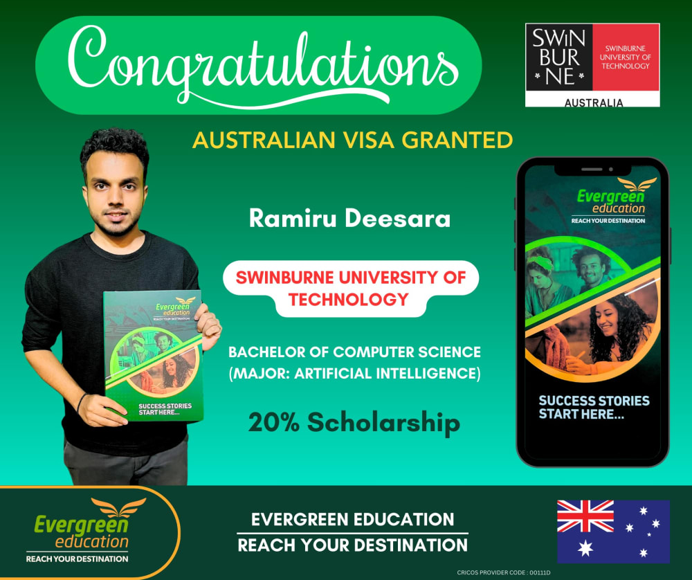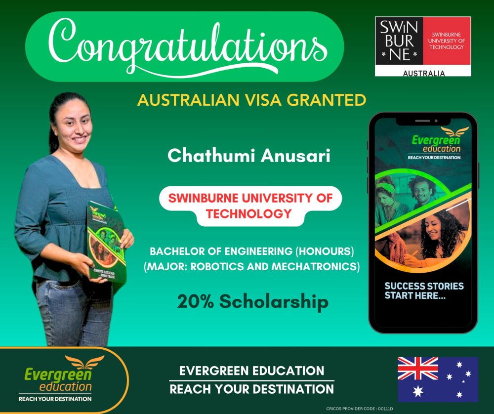 "...Evergreen’s dedication and professionalism helped me secure my student visa efficiently, along with a 20% scholarship for my master’s degree at Swinburne University. Their step-by-step assistance made the entire process seamless and reassuring..."